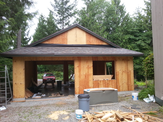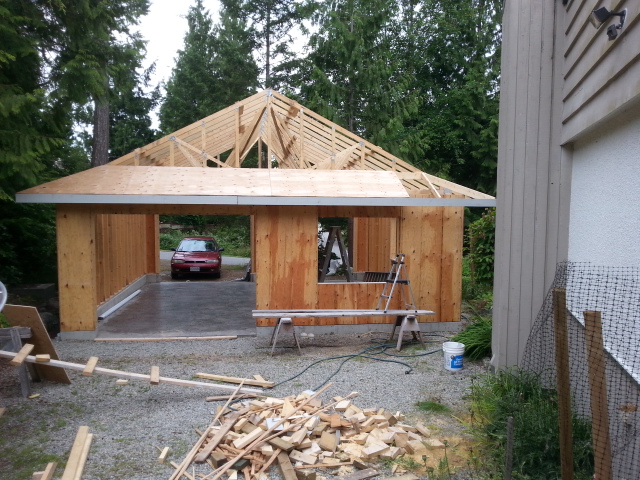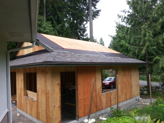 A friend came up from Vancouver to help with the roof sheathing. We got it done in a couple of days. Since then I have been making slow progress in between rain showers. It’s a great year for the garden, for building, not so much.