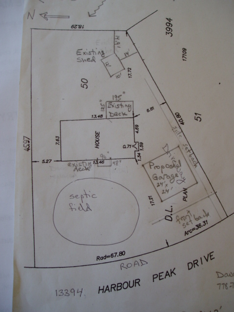 Above is the site plan. Currently the driveway extends from the road all the way back to the shed where there is a car/boat tent. The strategic placement of the garage turns the area behind the garage into garden space, provides privacy, and increases the deer-free zone. BTW the deer did not penetrate the newly constructed fences while I was away.