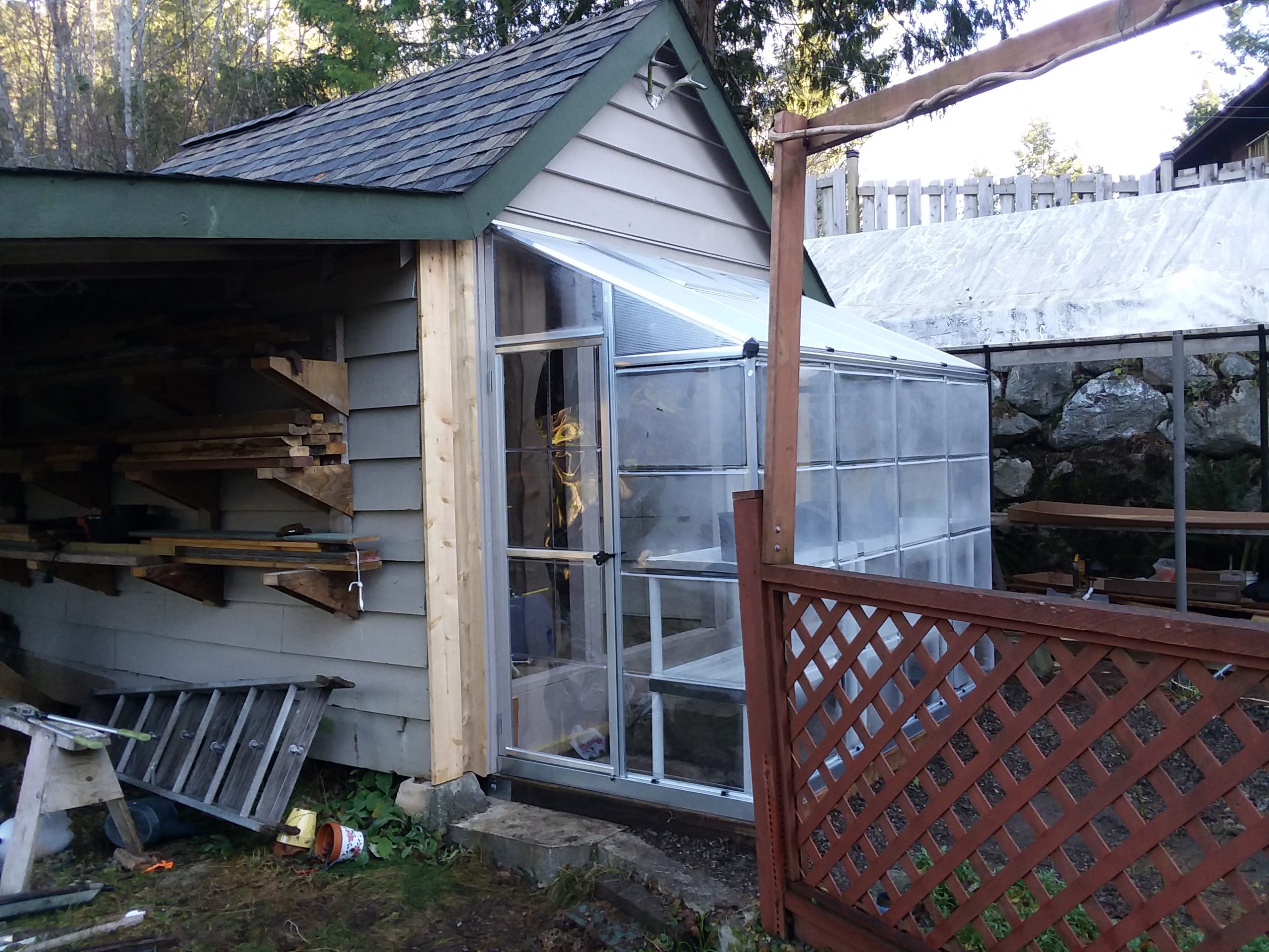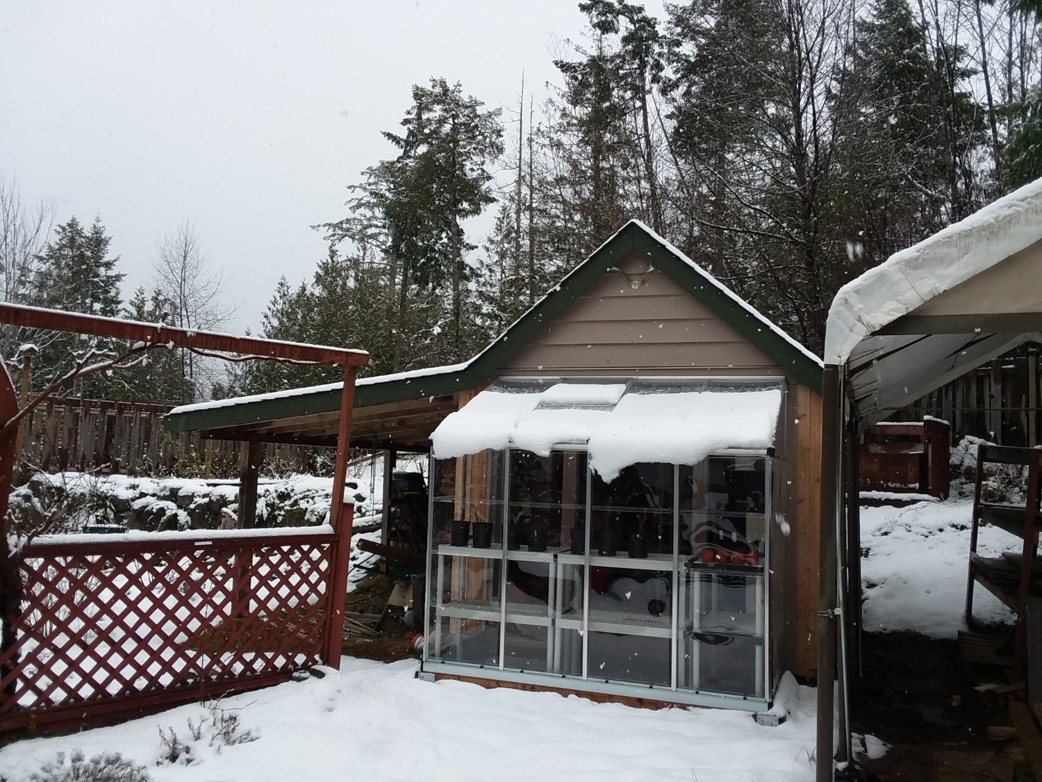 The greenhouse is small (4’x8′) but three 18″x36″ shelving units fit nicely, leaving good access to the shed interior. I moved in some pepper plants that I was overwintering in the garage and soon it will be time to start seeds.