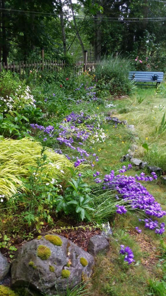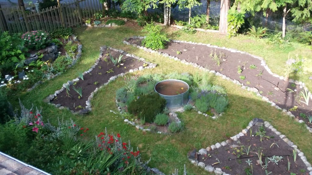 These past few weeks I’ve been working hard in the front garden, removing the grass from the funny shaped areas shown in this photo taken from the roof. I defined these areas a couple of years ago and just let them go wild. My idea is to have meadow areas with perennial flowers and I was slowly adding plants. It became obvious that the grass was going to out-compete most other plants and so I decided to remove it before planting more seriously.