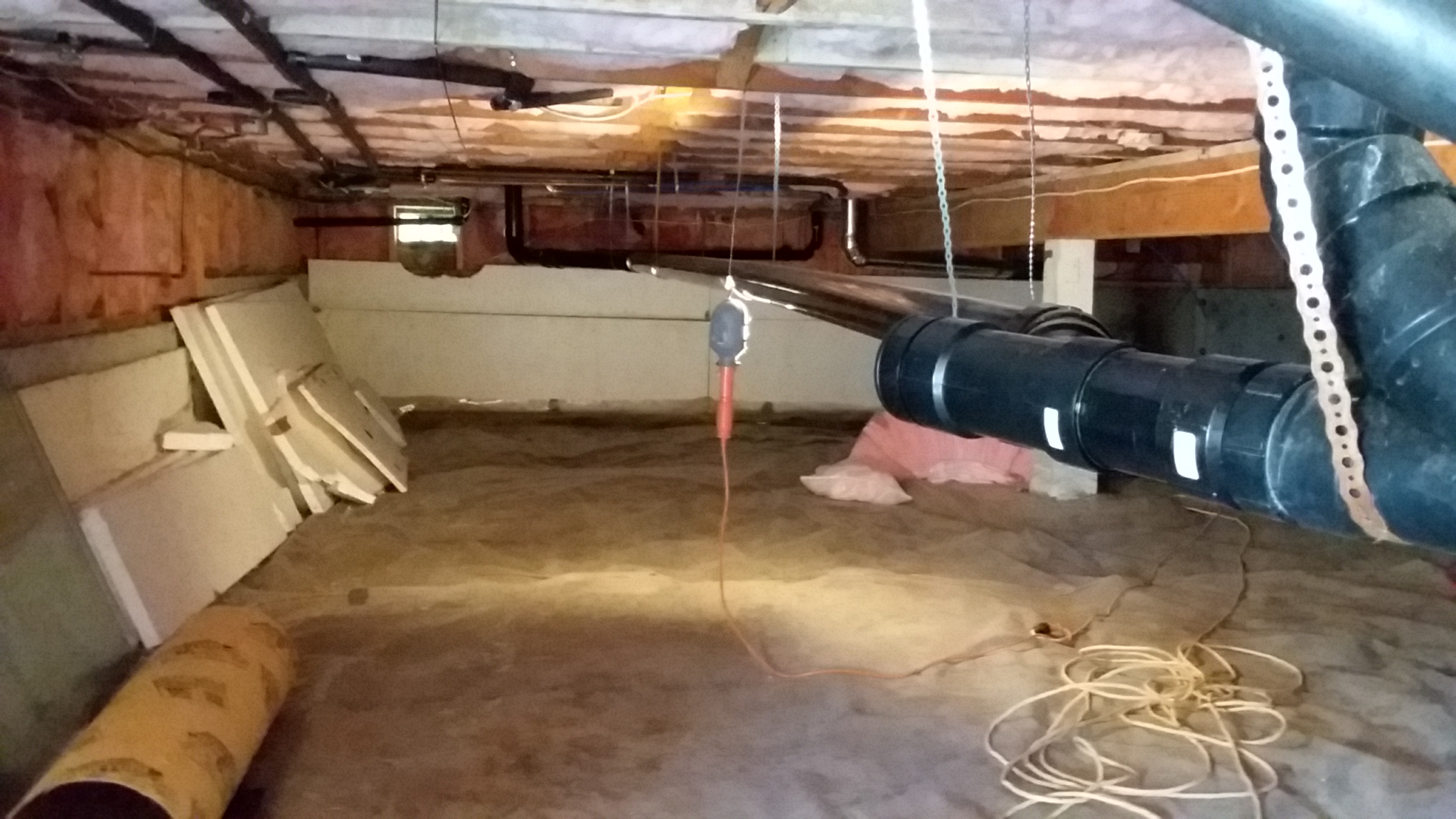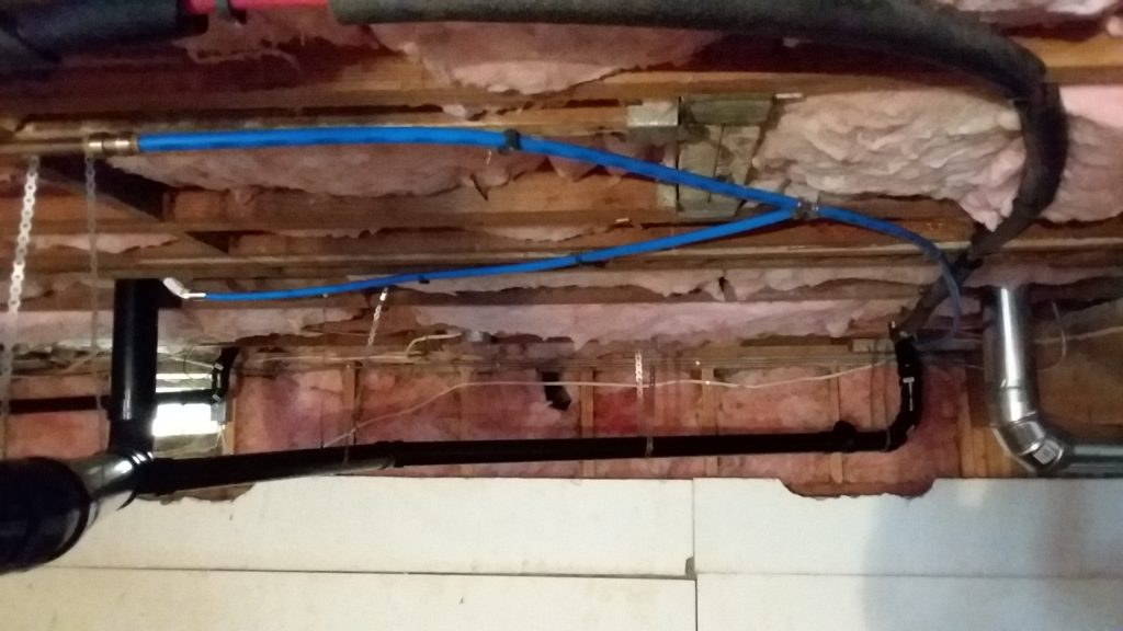 Welcome to my crawlspace. All the waste plumbing starting in the foreground and back to the far wall I installed. Below you can see all the details: the toilet pipe, the 2″ laundry drain, and the new PEX supply lines.