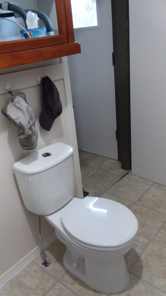 This is what the project was all about, adding another toilet and creating a new half bathroom. As the building inspector said when he looked at the toilet rough-in “I see the magic”. It truly is a marvellous addition. You can see the bottom of a nice looking medicine cabinet which adds a bit of elegance to a very utilitarian room.