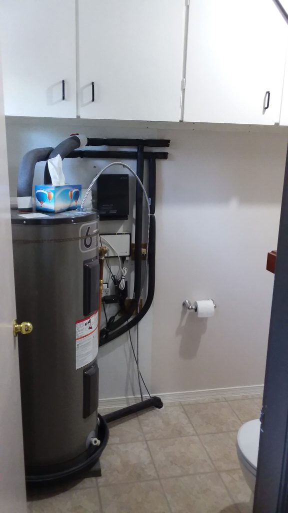 The picture above shows the entrance to the hardest working room of my house. You see the hot water heater, Internet gear, and a line of old kitchen cabinets along the far wall which serve as pantry and other much appreciated storage. The water supply pipes used to run along the wall under the cabinets and the laundry drain pipe used to run along the floor. Also in the middle of that wall was the dryer vent exit with a flexible pipe running along the floor to the dryer.