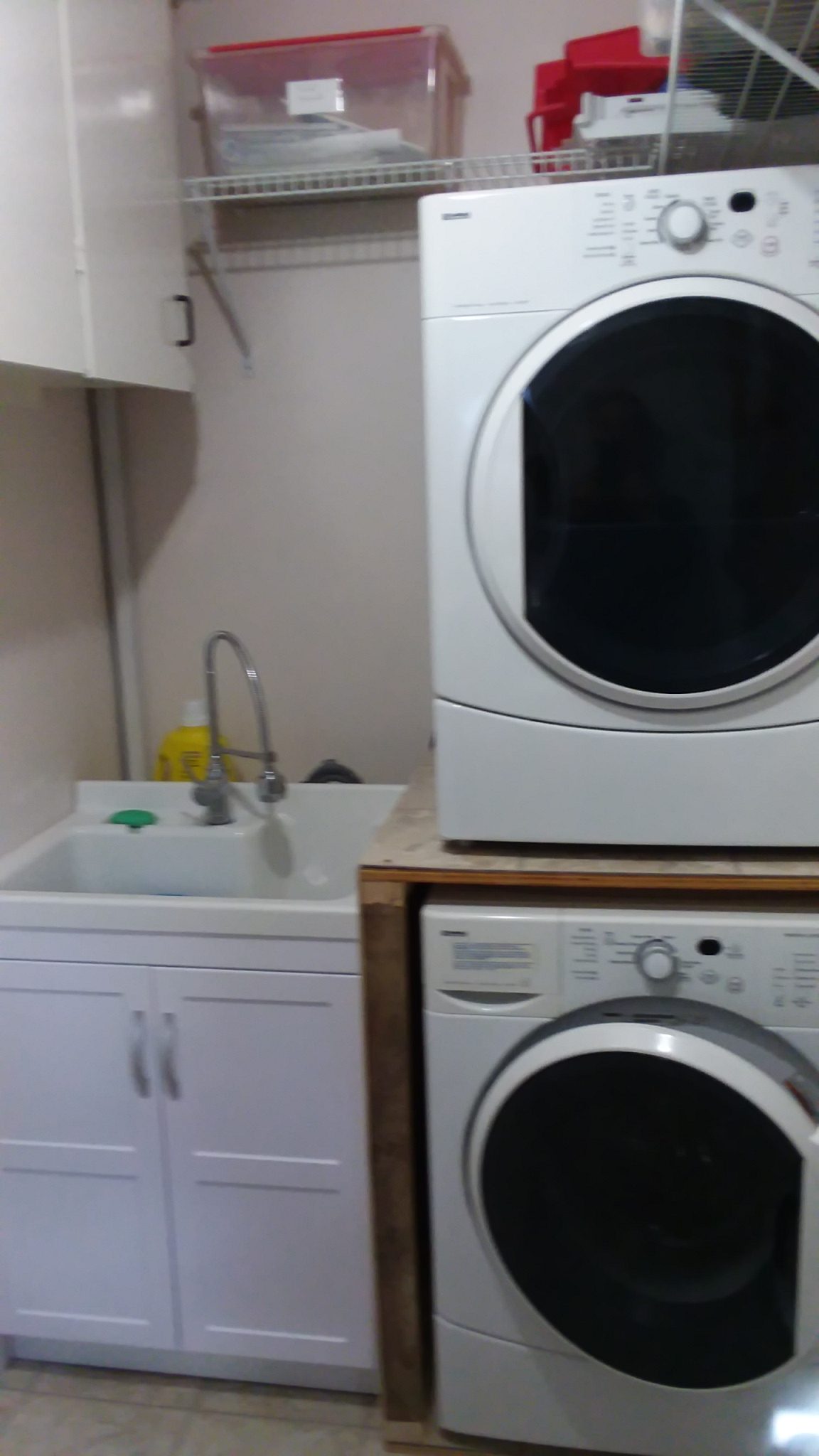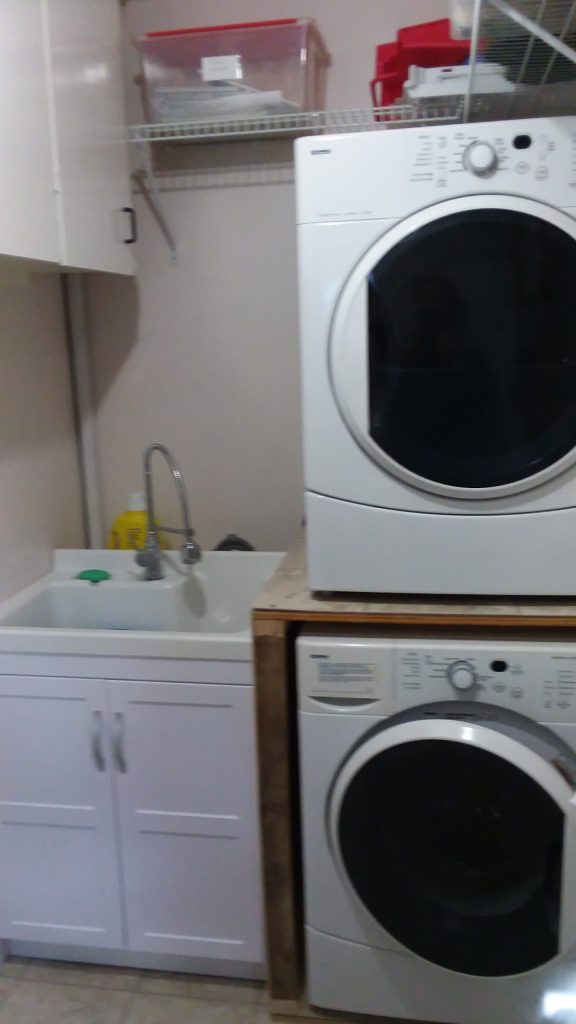 Looking right you see the new laundry sink and stacked clothes washer and dryer, which I did last year and was the start of this renovation. Above the sink and running all along the other side wall is a wire shelf which provides more needed storage space.
